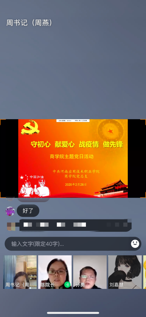 2月28日晚上,国产又猛又黄又爽的视频全体党员同志以网络视频的形式召开了一次特殊的主题党日活动。此次党日活动是积极响应习近平总书记关于新型冠状病毒感染肺炎疫情防控系列重要指示批示精神,充分发挥好疫情防控期间基层党组织战斗堡垒作用和党员先锋模范作用,根据学校《关于组织开展“守初心、献爱心、战疫情、做先锋” 线上主题党日活动的通知》召开的。学校党委委员陈君丽同志作为支部成员全程参与主题党日活动。周燕副书记主持活动。