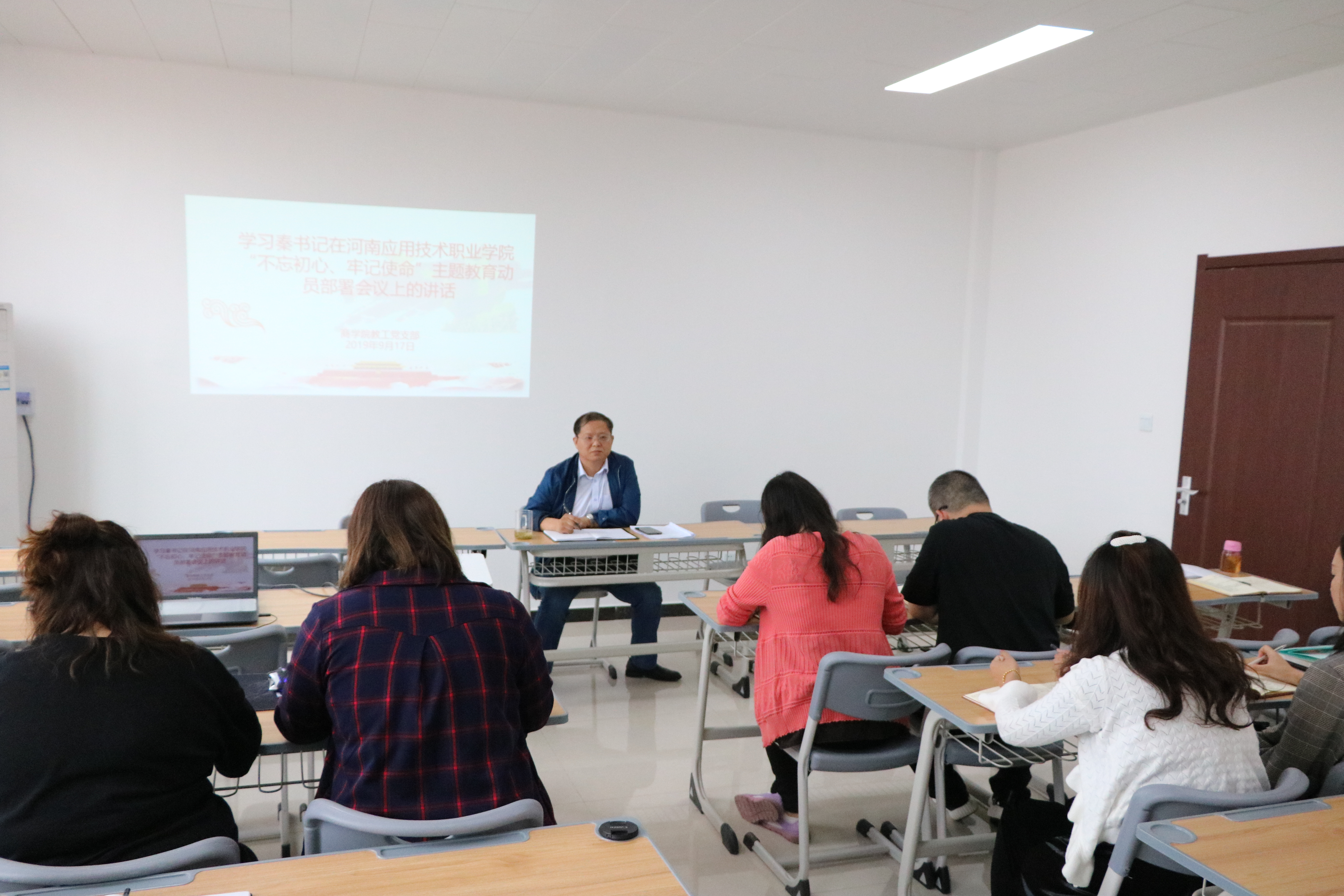 会上,孙勇首先做了动员讲话,办公室主任刘嘉慧等三位教师领学习《河南应用技术职业学院“不忘初心、牢记使命”主题教育工作实施方案》、党委书记秦书君同志在学校“不忘初心、牢记使命”主题教育动员部署会议上的讲话以及习近平总书记在“不忘初心、牢记使命”主题教育工作会议上的重要讲话。