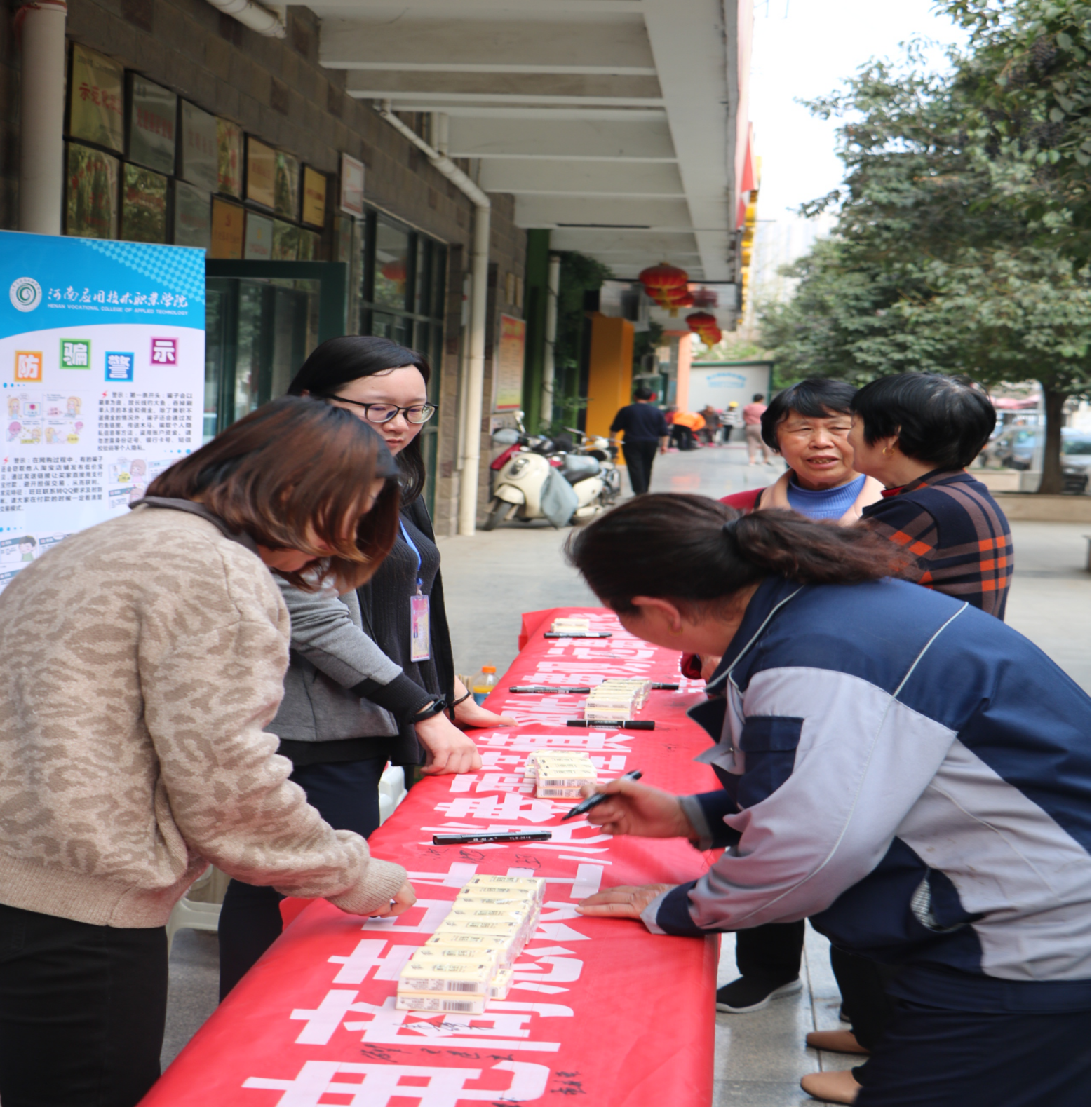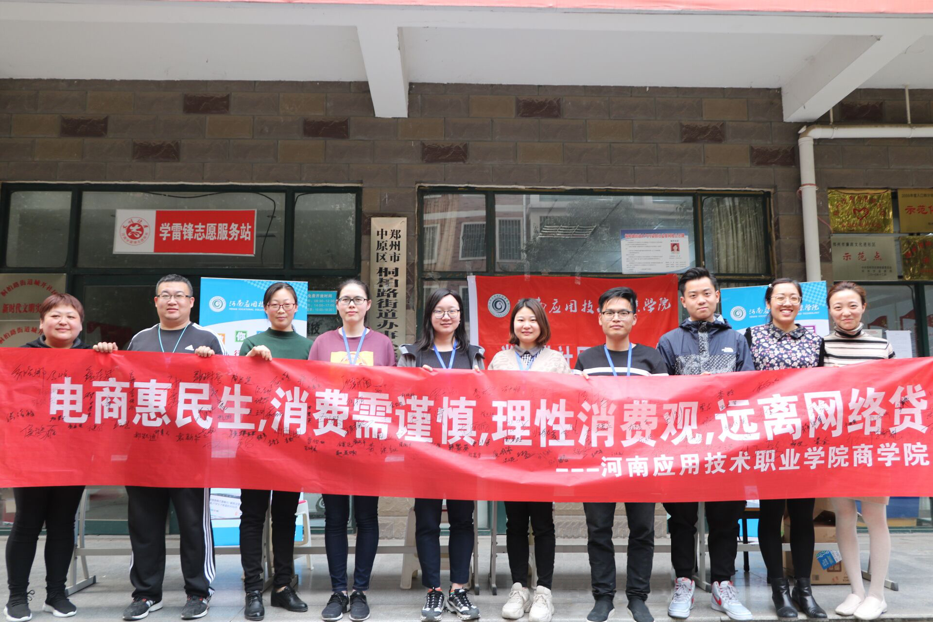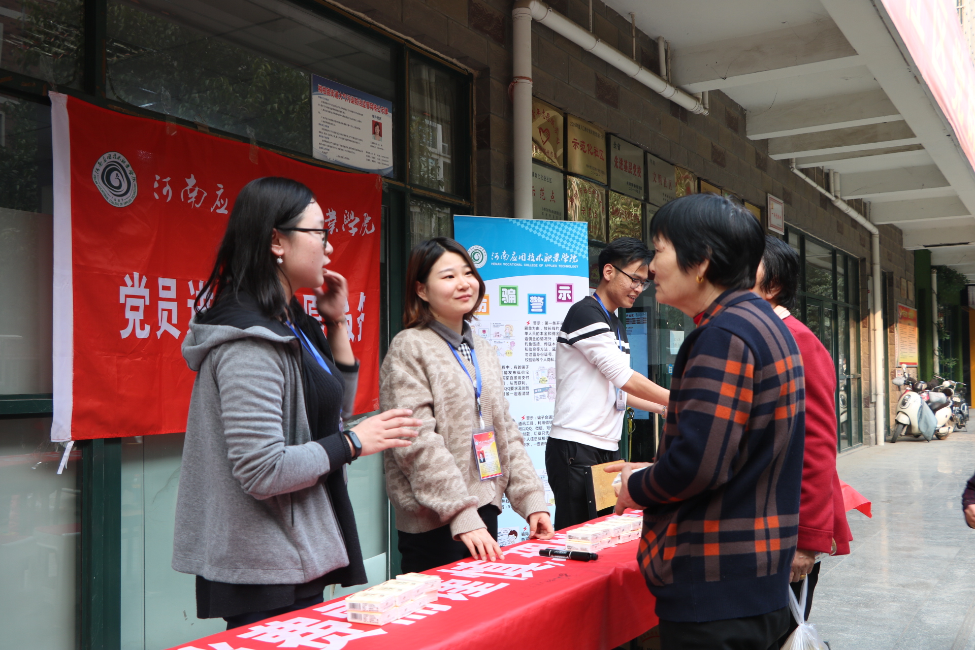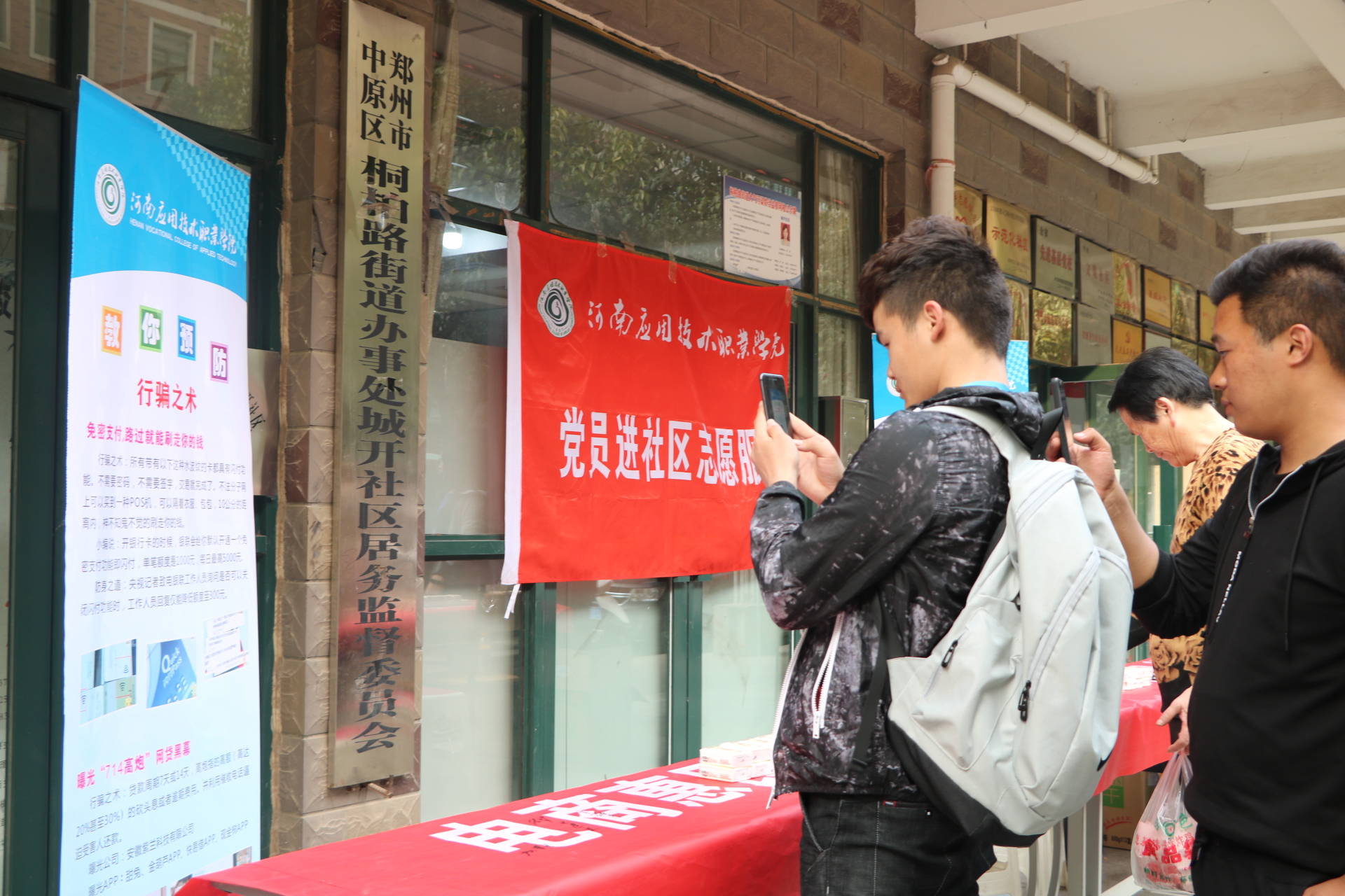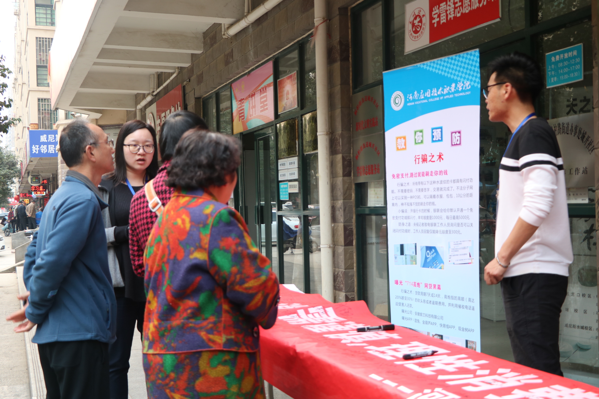近年来,随着信息化、电子商务的发展,“网购”、“电商”普惠民生的同时,消费陷阱与网络诈骗也伴随之增多,披上华丽的外衣让人眼花缭乱。为了让社区居民提升金融风险防范意识,提高识骗防骗能力,河南应用技术职业学院党员志愿者专程来到郑州城开社区,开展以“电商惠民生,消费需谨慎,理性消费观,远离网络贷”为主题的党员志愿活动。