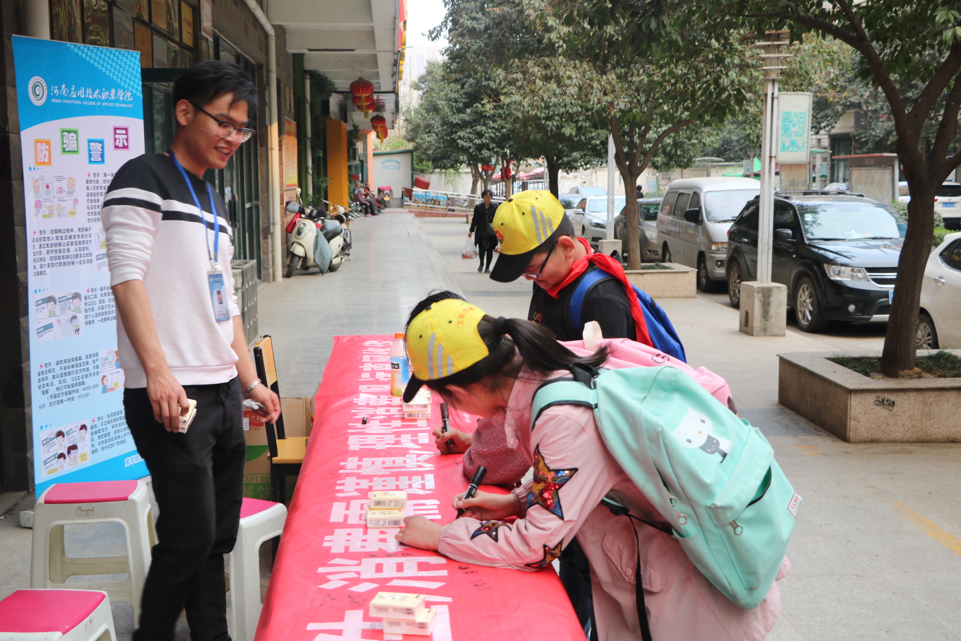 海报上醒目的“防骗”标题吸引了社区里来往的人们,很多居民驻足了解,有些指着海报问询,有些拿出手机询问,有些拍照记录,志愿者们对于提出的问题热心地解答。社区老年人对于这个主题尤为关注,纷纷说这个主题很好,有些还帮助拉住年轻人共同了解防骗知识。有些小朋友也主动跟志愿者聊天,说要回家和家人进行分享。