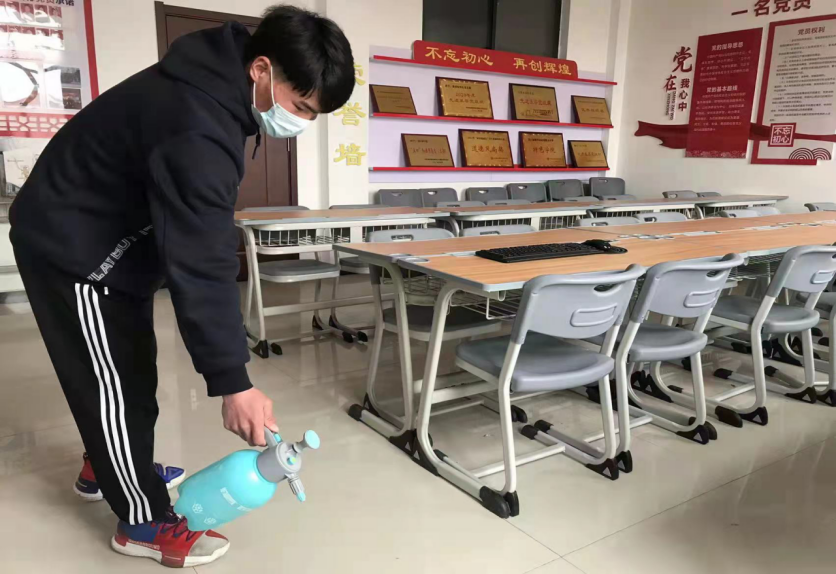 志愿者对实训室进行消杀