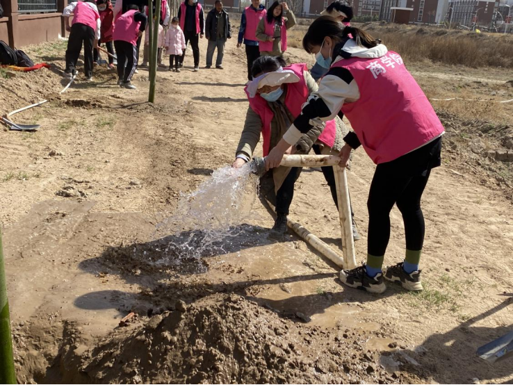 植树活动现场,师生志愿者们分为若干小队分扛树苗、发铁锨、搬水管大家充分发挥团结、互助的精神,明确分工、紧密合作。挖坑、栽植、回填、覆土、保墒、浇水等步骤有条不紊地进行着。党总支书记苏云峰、副书记王倩带着师生们一起为树浇灌,不畏辛苦,最终在大家的共同努力下,为校园环境增添一一抹新绿,师生共同期待来年小树迸发蓬勃生机。