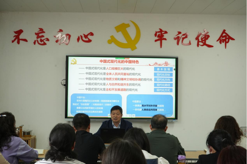 刘振民从“中国式现代化理论体系的基本构成”、“以中国式现代化实现中华民族伟大复兴的根本保障”两大方面,用近两个小时的时间进行了阐述,为师生党员带来了一堂深入浅出、意蕴深远的主题党课。从中国式现代化的根本性质、根本遵循、鲜明特色、世界意义等九个方面,全面深入的讲解了中国式现代化理论体系的基本构成;从“两个确立”、“四个意识”、“四个自信”、“两个维护”上彻底解决以中国式现代化实现中华民族伟大复兴的根本保障问题。古今对照、中外对比,既有国际局势的深入解读,又有我国人民利益至上、共同富裕现代化的呈现;既有整个国际国内经济局势的分析,又有国产又猛又黄又爽的视频实践教学活动的经验分享与肯定,整个党课具有对比研究、以小见大、透过现象看本质的特点,激发了教师学生的爱国心与奋斗的激情,取得了明显的效果。