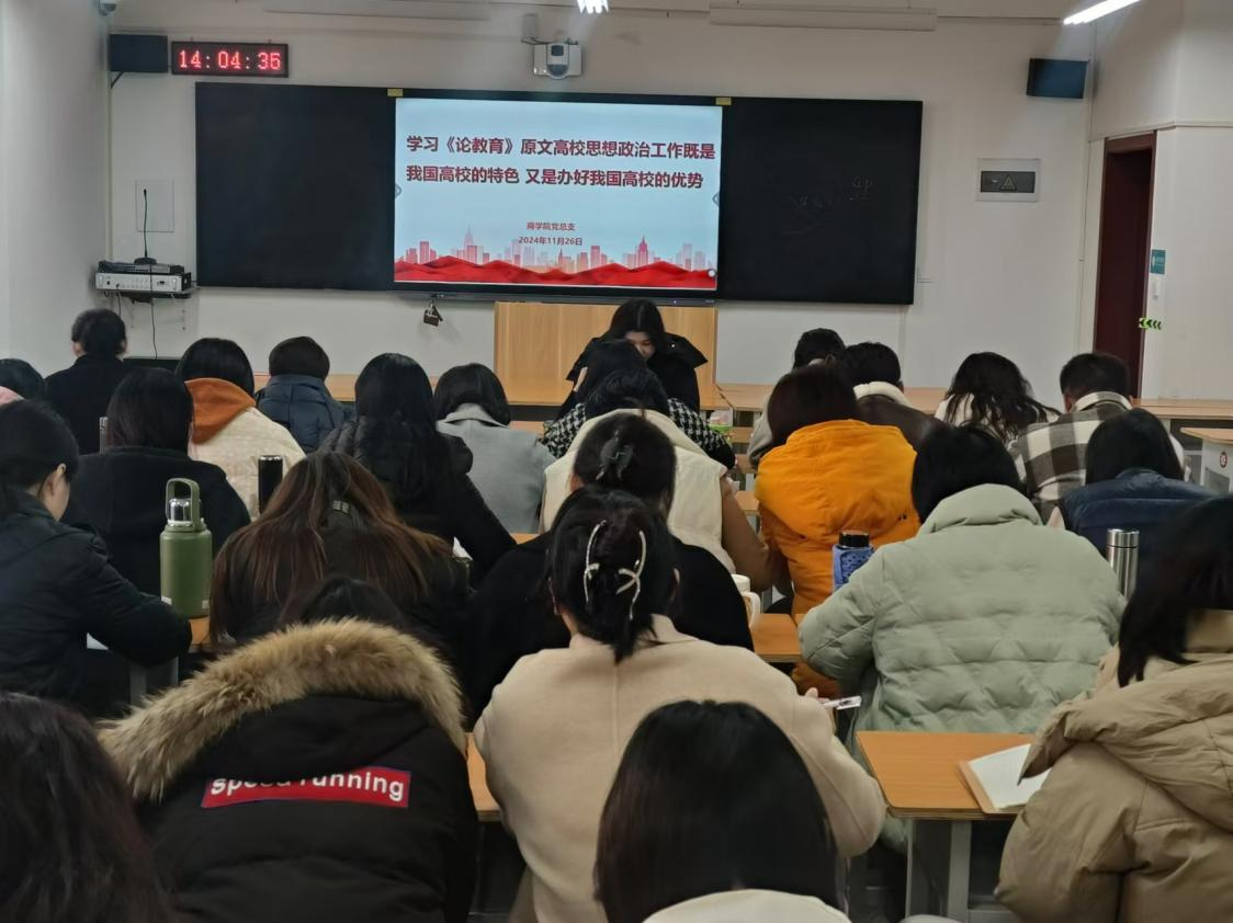 随后,纪检委员施雨静带领大家共同学习了《论教育》中的相关篇章。其中,“加强革命传统教育,把红色基因一代代传下去”的论述,让大家深刻认识到革命传统教育的重要性和紧迫性;而“高校思想政治工作既是我国高校的特色,又是办好我国高校的优势”的观点,则进一步明确了高校思想政治工作的地位和作用。