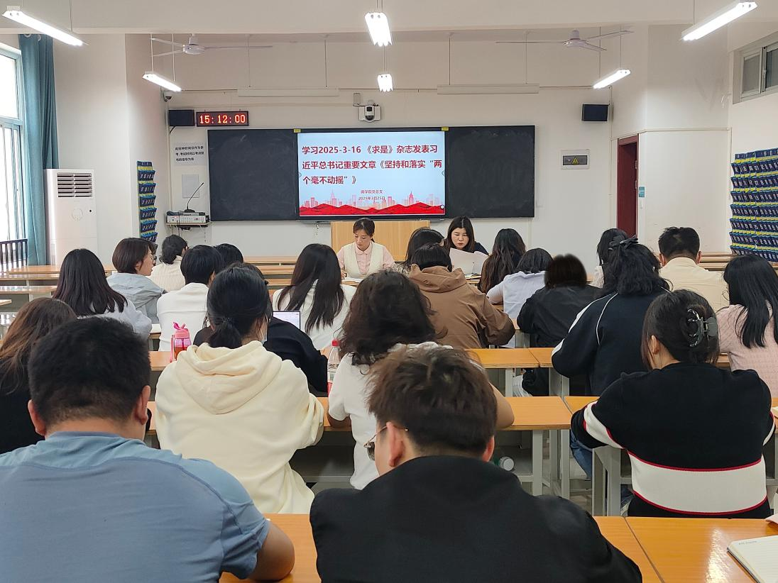 会上,刘嘉慧带领全体教师学习了《求是》杂志发表的习近平总书记重要文章《坚持和落实“两个毫不动摇”》和《习近平文化思想学习纲要——推动文化繁荣,建设文化强国》相关内容。通过学习,教师们纷纷表示要自觉以习近平文化思想学习为指导,做到把握好教育新时代宣传思想文化工作的新形势新任务新要求,增强推进新时代高校教育文化高质量发展的扎实本领。
