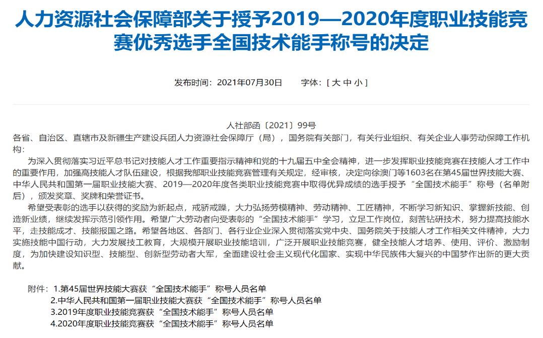 据悉,“全国技术能手”称号是国家技术人才评选表彰制度的重要组成部分,是由人力资源和社会保障部技能人才评选表彰办公室组织进行的对优秀技术工人的评选认可称号。该称号旨在以评选表彰为引领,弘扬劳模精神和工匠精神,营造尊重劳动的社会风尚和精益求精的敬业风气,激发技能人才创新创造活力,激励广大青年走技能成才、技能报国之路。