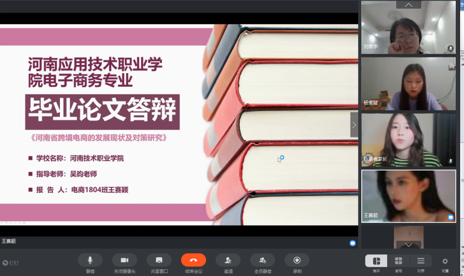 毕业论文是对学习成果的综合性总结和检阅,也是检验学生掌握知识的程度、分析问题和解决问题基本能力的一份综合答卷。为在疫情防控需要下保障教学质量,国产又猛又黄又爽的视频于2020年5月26日通过钉钉在线会议的形式,组织了2018级各专业优秀毕业论文线上公开答辩活动。