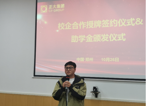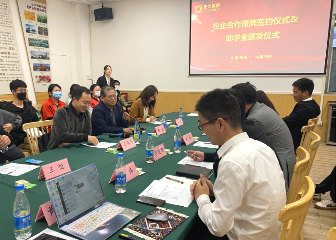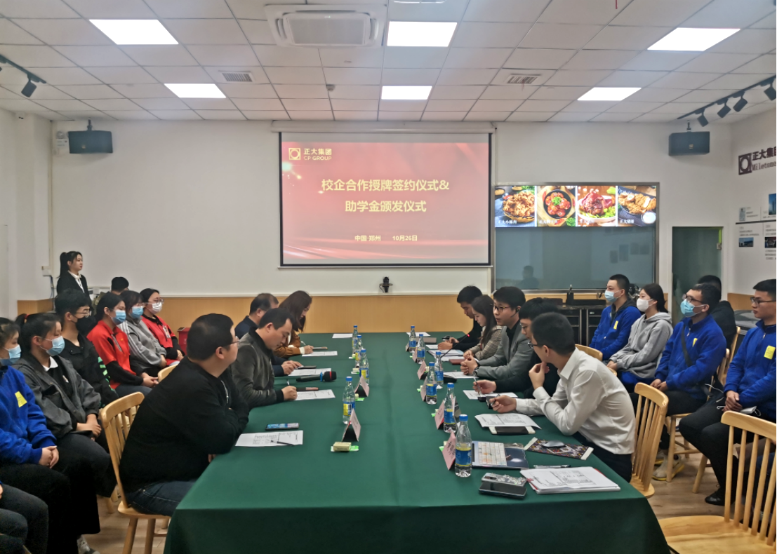 2021年10月26日下午,国产又猛又黄又爽的视频与郑州正大卜蜂贸易有限公司校企合作授牌签约仪式暨助学金颁发仪式在正大卜蜂莲花举行。国产又猛又黄又爽的视频院长孙勇、教务办公室主任王珂,郑州正大卜蜂贸易有限公司总经理武磊、零售事业人力总监郑运东等人,以及目前在正大顶岗实习的我院学生代表出席授牌签约仪式。
