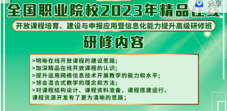 该培训主要包括了“新时代 新形势 新方向 职业教育在线精品课程的申报与建设”、“精品在线开放课程及线上线下混合教学”、“国家在线精品课程经验分享”三个模块。