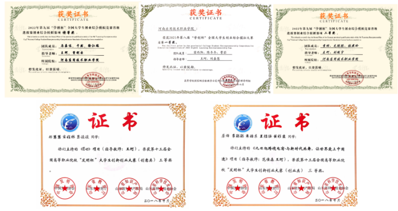2021年、2022年“学创杯”全国大学生创业综合模拟竞赛,省级选拔赛创业综合模拟赛项获:特等奖、一等奖和二等奖。