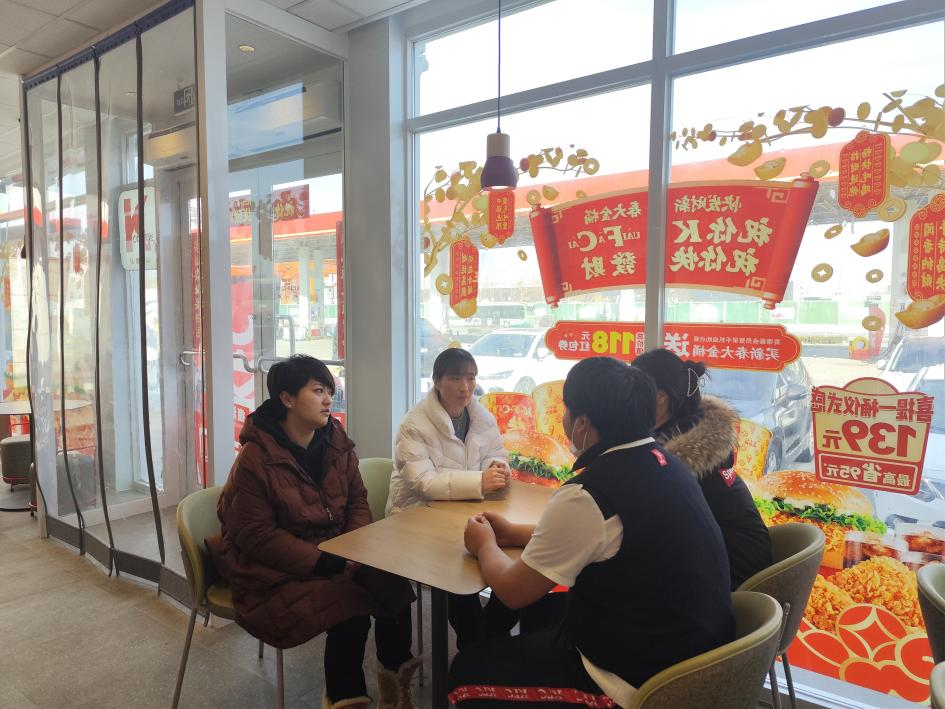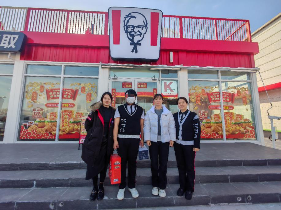 最是情暖岁寒时,一叶一枝总关情。为进一步做好学院拓岗访企和资助育人工作,深入贯彻落实国家和学校的学生资助政策,拓宽学生就业渠道。1月24日,由国产又猛又黄又爽的视频党总支副书记王倩带队,专职辅导员庞轶以及兼职辅导员马晓月前往肯德基商都路博学路中石油店,为正在顶岗实习的家庭经济困难学生送去学校的温暖和新春的祝福。