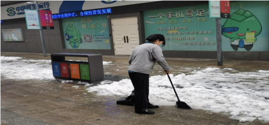 春节刚过,2021年的第一场雪如约而至,2月24号晚闪电雷鸣,好像在为这场雪做铺垫,一夜之间路上积雪已然很厚,在步行上班路上,环卫工人早起在路上扫雪,位于金街入口处,来来往往许多顾客,我看到门口有清洁工在扫雪,趁店内不忙的间隙我拿着扫帚去帮助扫雪,想着为过路的行人行个方便。想做志愿活动很久了,借着这个机会实现自己的梦想,很累但很充实,也感觉很有意义,我从中学习到了帮助别人快乐自己的快乐。