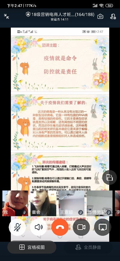 主题班会通过视频会议形式进行,辅导员老师们通过宣讲、倡议等方式,引导全体学生关心国家大事,学习习近平总书记关于疫情的重要指示精神,了解国家关于疫情防疫的重要决策部署,引导学生正确面对疫情,不恐慌,不信谣,不传谣。