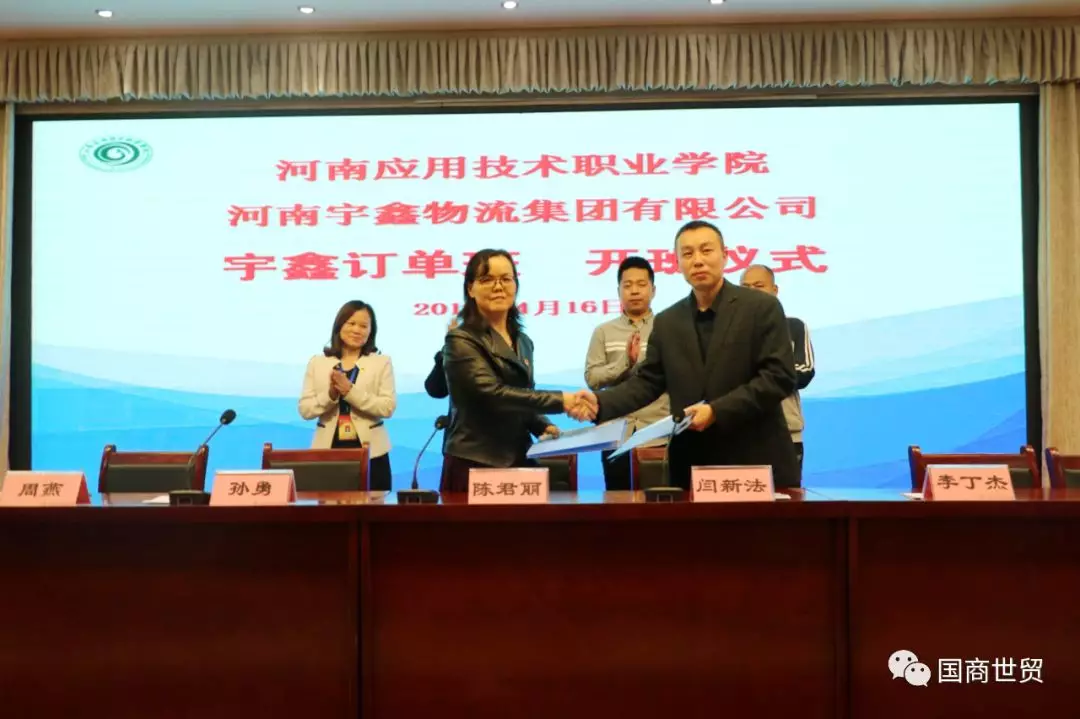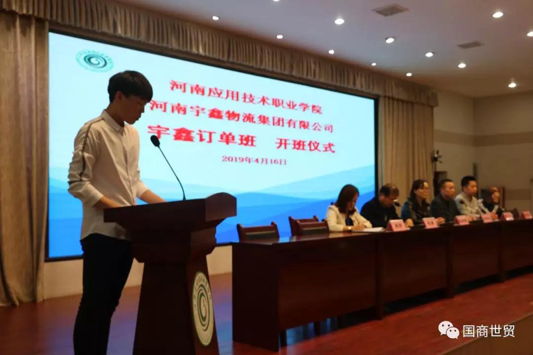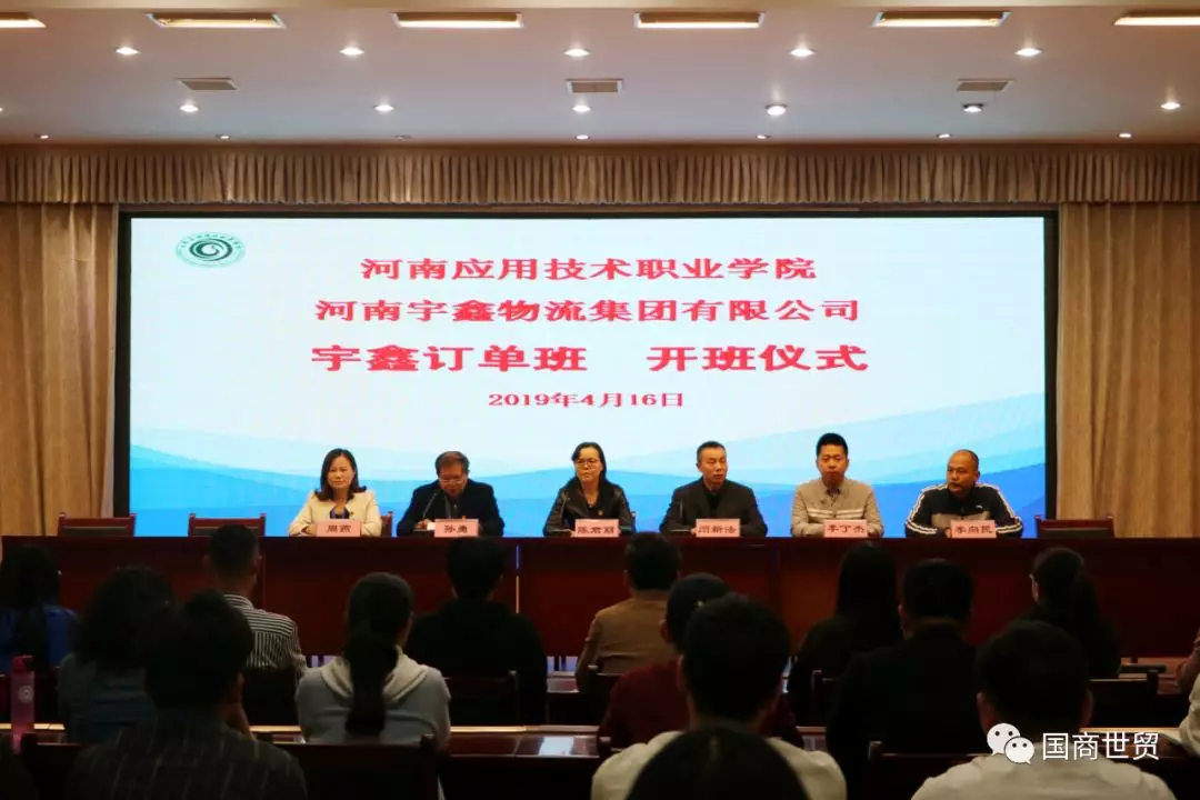 2019年4月16日,我校国产又猛又黄又爽的视频与河南宇鑫物流有限公司举行了校企合作“宇鑫订单班”开班仪式。开班仪式在我校实训中心二楼会议室进行,学校党委委员陈君丽院长,校就业办李向民主任、国产又猛又黄又爽的视频党总支周燕书记,宇鑫物流集团人力资源总监闫新法同志、人力资源经理李丁杰同志出席。开班仪式国产又猛又黄又爽的视频孙勇院长主持,物流专业全体学生及国产又猛又黄又爽的视频老师参加。