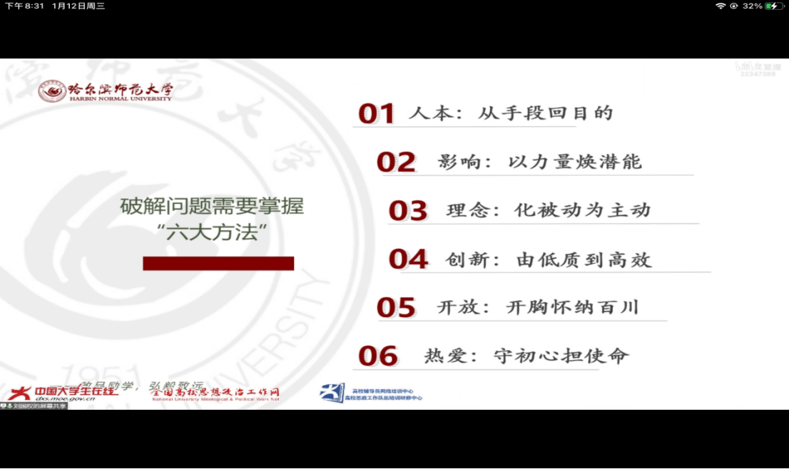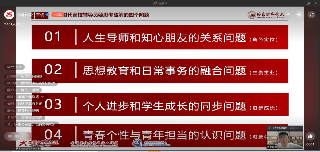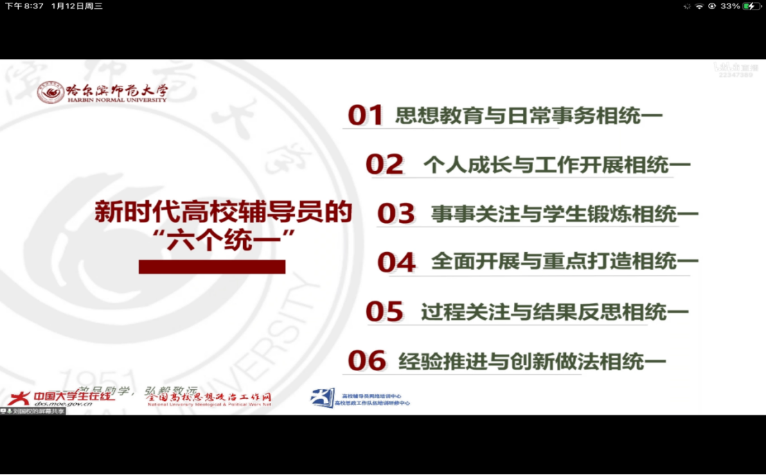 1月12日晚上,国产又猛又黄又爽的视频全体辅导员教师通过中国大学生在线网共同观看了哈尔滨师范大学马克思主义学院刘国权老师讲授的《新时代高校辅导员要思考与答好的“四个问题”》直播大讲堂。