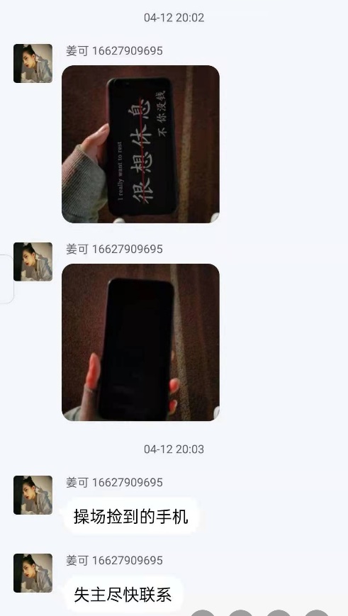 电商2002班尹冉:从小到大听过的好人好事不计其数,但这次,就在我的身边。她叫姜可,是我的一个室友,同时也是爱心社的一位成员。在四月十二日的那天晚上,她像往常一样在操场上散步,在她正在要拐弯的时候,发现地上有一部手机。据她的描述,捡了手机之后,她在原处等了一会儿,没有失主来找,又问了附近的同学,也都不是他们的。于是她便把手机带了回来,并在学校的失物招领群发布了消息,让失主尽快与她联系。终于,在第二天上午,失主看到了她发的那条消息,把自己丢失的手机拿了回去。虽然只是一件小事,但越是小事,越能看出来一个人的人品,我很幸运我拥有一个这样的室友,