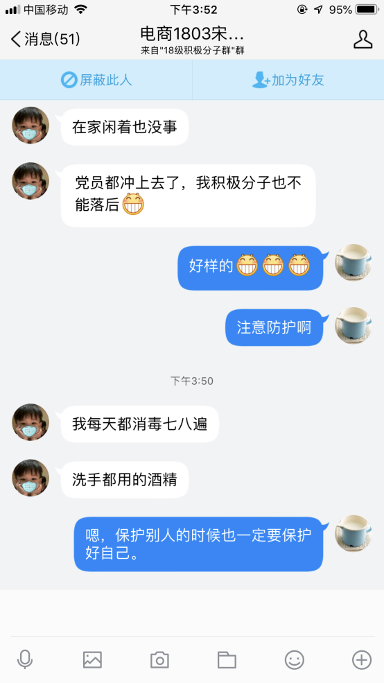 2、电商1803班宋潇南、裴成阳2位同学参与防疫志愿工作,在郑州市航空港区管委会担任疫情防空检测员。宋潇南同学平时就是个质朴热心的人,2019年郑州民运会期间就主动报名参加志愿服务。当问起这次的疫情志愿工作时,他说:党员都冲上去了,我作为积极分子也不能落后。”