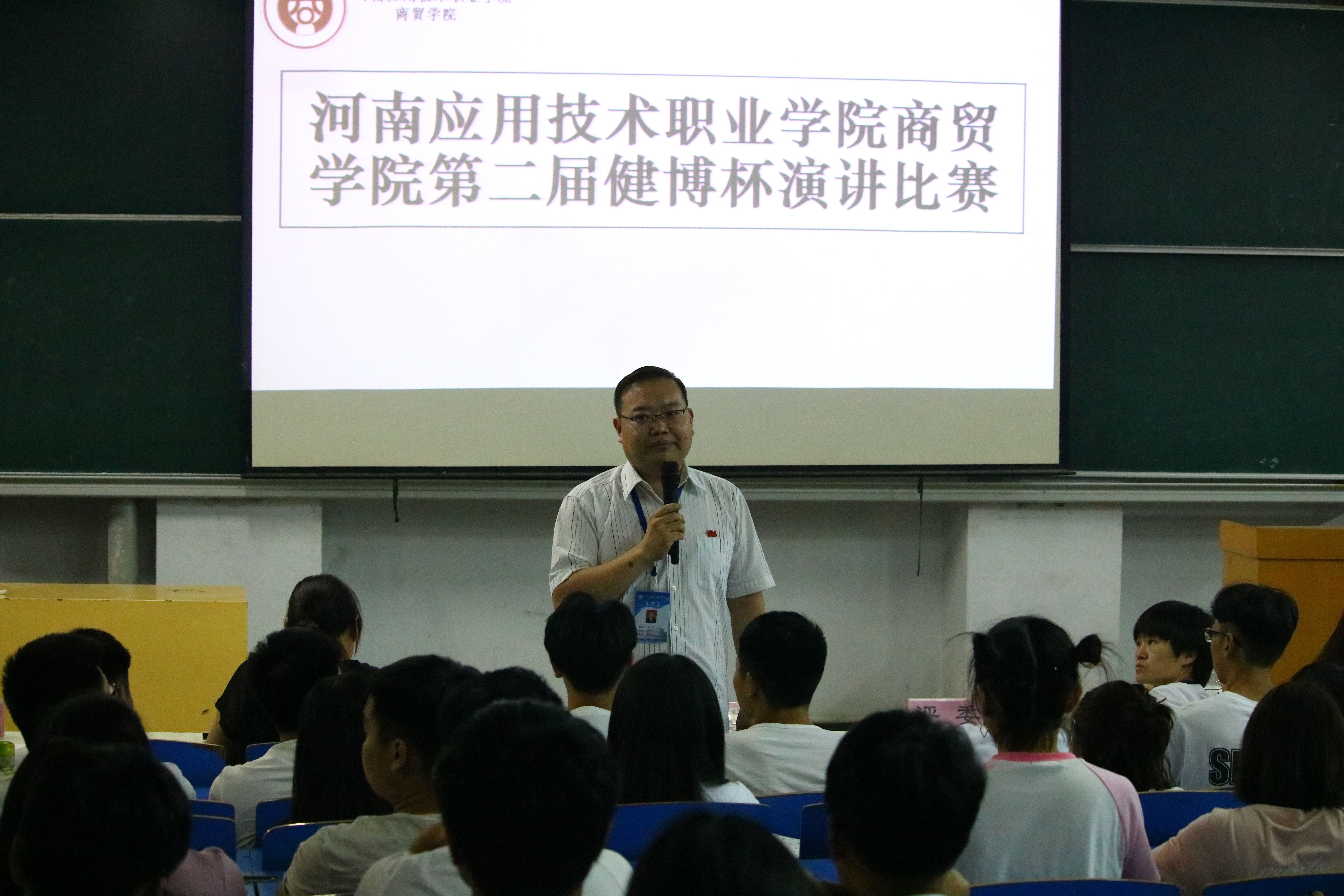 2017年5月24日晚上,由河南应用技术职业学院商贸学院党总支主办,郑州健博医疗器械有限公司赞助的第二届“健博杯”演讲比赛决赛在二号教学楼B102教室完美落幕。本次竞赛的主题是新时代下大学生如何树立正确的就业观和择业观。
