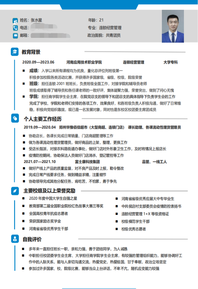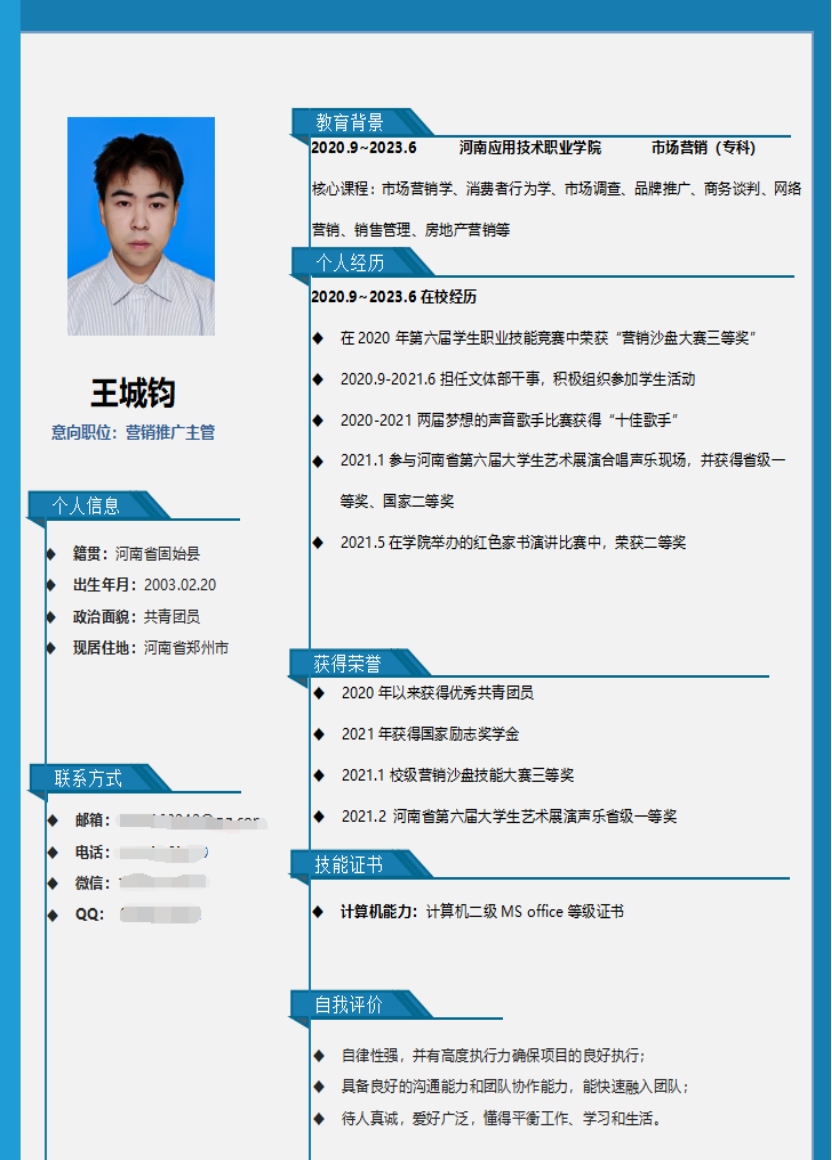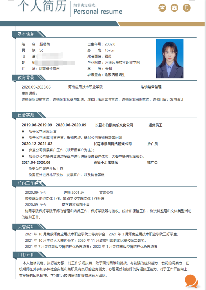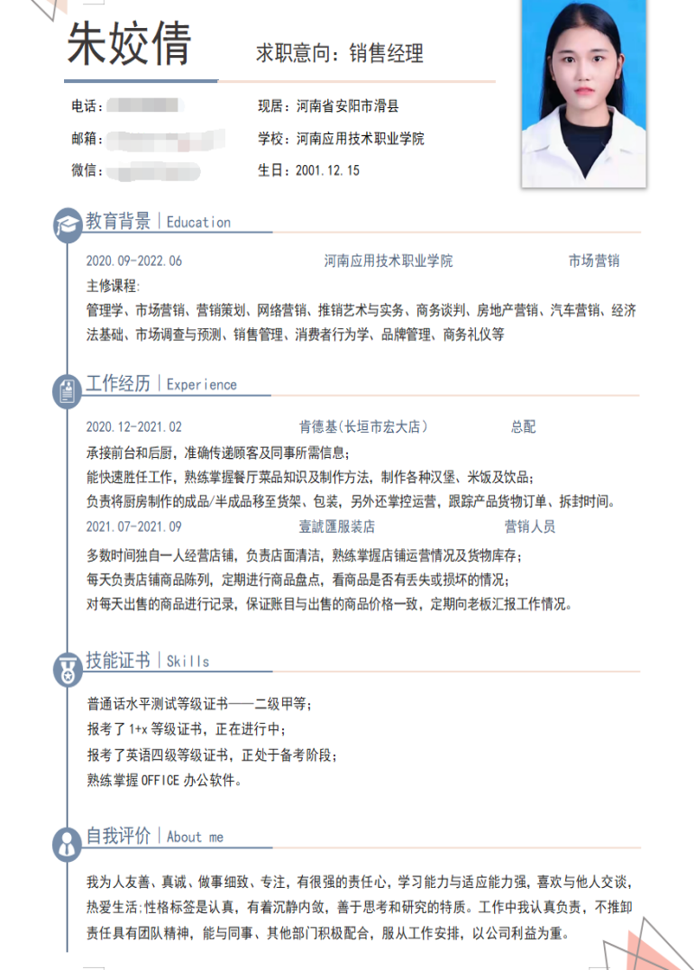 简历是展示自我的一块求职“敲门砖”,为帮助国产又猛又黄又爽的视频20级学生增强就业意识,充分做好就业准备,制作出优秀的简历并能在求职过程中成为自身的“重要法宝”。国产又猛又黄又爽的视频开展了第五届简历设计制作大赛,国产又猛又黄又爽的视频20级全体学生参与了简历制作。下面我们来共同欣赏20级求职小可爱们的优秀简历吧!