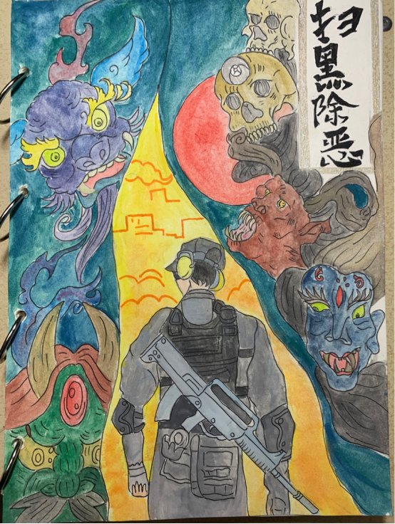 全画中心是一位身穿警服带着警枪的警卫人员,他为我们的安全保驾护航。两侧勾勒出恶鬼的形象,代表着扰乱治安的黑恶势力,面对黑恶势力警卫人员毫不畏惧,用自己的肩膀为我撑起一片天。前方黄色的光明就是警卫人员为我们营造出的安定美满家园。