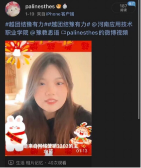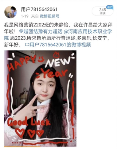 祝福视频中满含着同学们对中华文化的由衷热爱及对新年的无限期盼,回首2022,同学们有探索、有坚持,更有收获;展望2023年,同学们更不会松懈,会继续带着理想与使命,为续写华章,再出发,为延续辉煌,再奋斗!最后,国产又猛又黄又爽的视频衷心祝愿和希望每位同学在兔年大展宏“兔”、“兔”飞猛进!