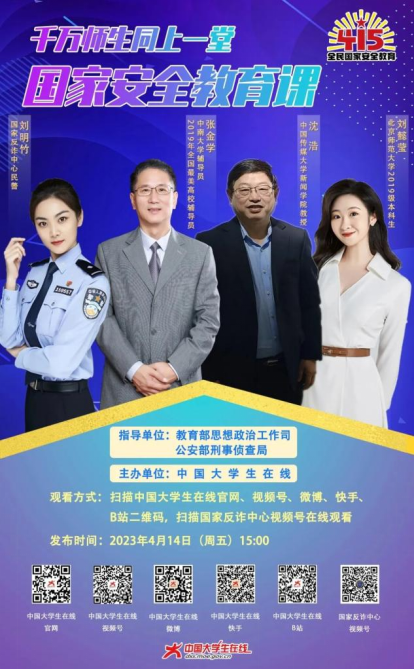 在第八个全民国家安全教育日到来之际,在教育部思想政治工作司、公安部刑事侦查局指导下,中国大学生在线面向全国高校师生共同推出《千万师生同上一堂国家安全教育课》,采取线上发布课程的形式,邀请中国传媒大学新闻学院教授沈浩,2019年全国最美高校辅导员、中南大学辅导员张金学,国家反诈中心民警刘明竹,北京师范大学2019级本科生刘懿莹联合为全国师生讲授。