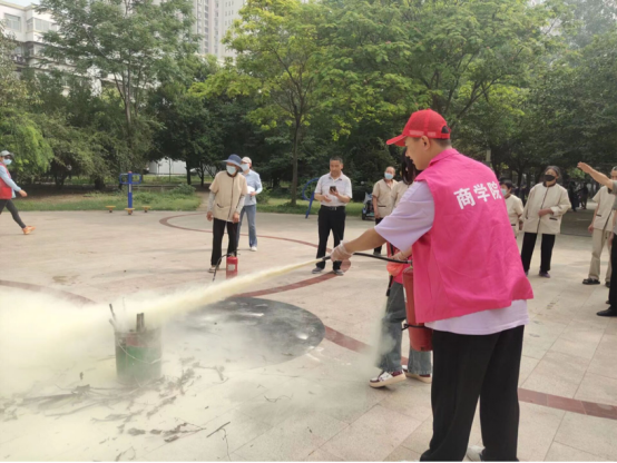 大扫除活动过后,志愿服务队参加了社区的消防演练活动,通过学习和亲身实践,同学们加强了对于消防安全的认识同时也熟悉了消防器材的使用,随后协助社区工作人员向居民们演示讲解灭火器的正确使用方法,帮助增强社区居民的消防安全意识,预防消防事故的发生。