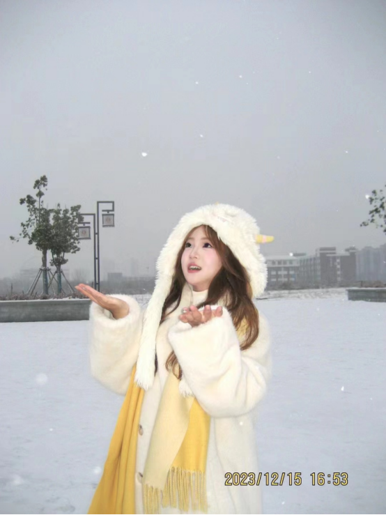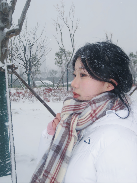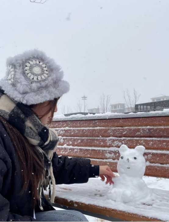 在风雪中,她如同一朵独舞的花,人与雪景相映成趣,灵动而优雅。