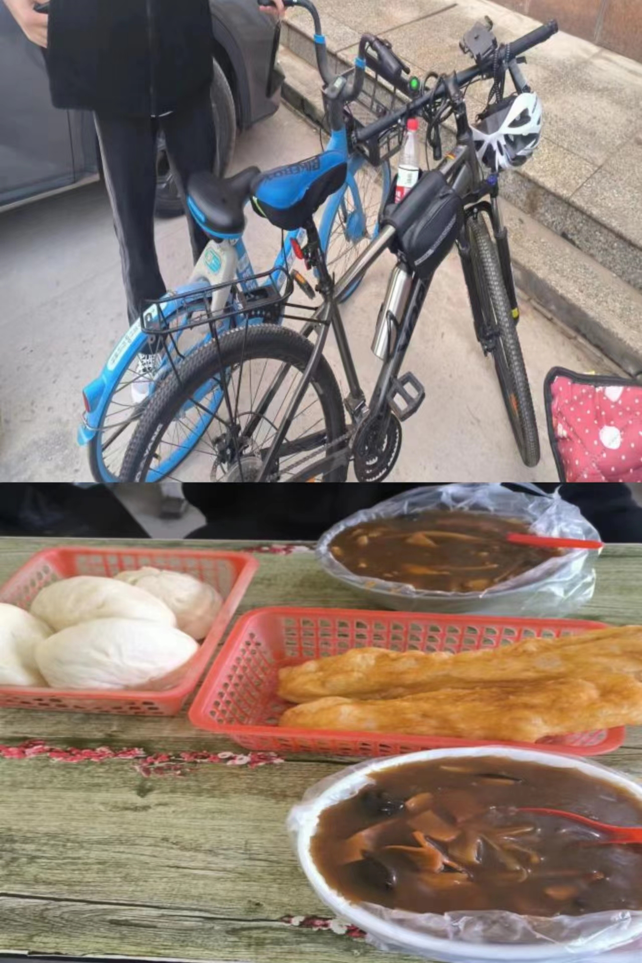 下午四点左右,成功与朋友汇合。我们两个整理好各自的东西准备出发。我骑得是山地自行车,朋友骑得是租的哈啰自行车。
