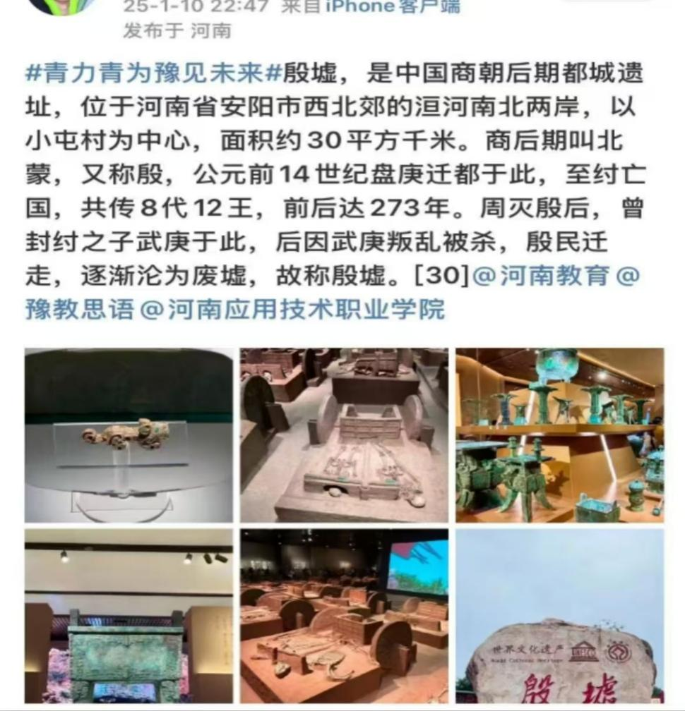 “殷墟文化是华夏文明的重要源头之一,承载着中华民族的历史记忆和文化基因,对增强民族认同感和文化自信意义深远,传承和守护是当代大学生应尽的义务。”—营销2403魏薇
