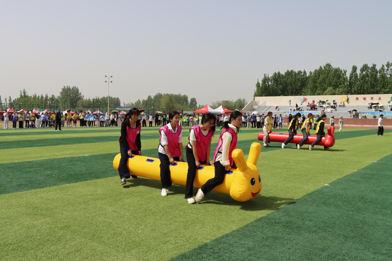 教职工趣味比赛成为赛场别样的风景线。比赛项目丰富,包含毛毛虫、运球上篮和集体跳大绳。毛毛虫比赛中,教职工分组骑在“毛毛虫”道具上,喊着口号奋力前冲,赛场氛围热烈;运球上篮时,老师们运球跑并投篮,有人动作娴熟,有人虽显慌乱却坚持完成比赛;跳大绳时,两位老师摇绳,其余老师依次跳绳,节奏把握良好,整个趣味赛充分展现了教职工积极向上的精神风貌。