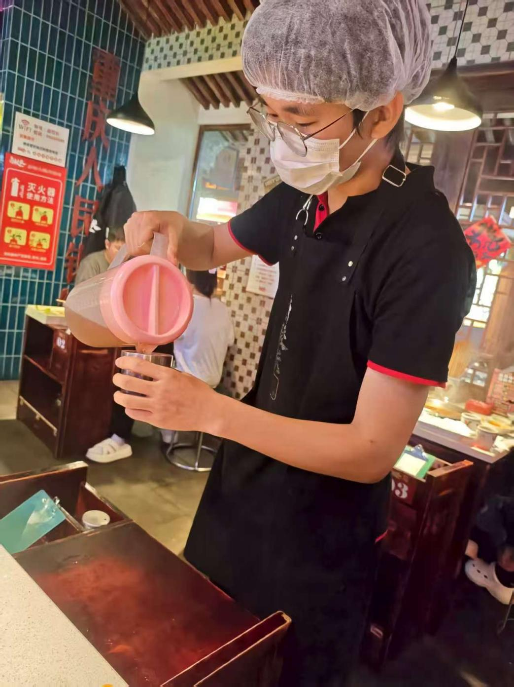 我的工作主要在前厅,从引导客人入座到协助点单、传菜。刚开始总记混菜品——卤校长的卤味有十几种,甜品更是摆满冷柜。为了分清“耙鸡脚”和“耙牛肉”的区别,我特意记了每种卤味的卤制时间;分不清甜品时,就趁空闲尝了尝,慢慢能根据客人需求推荐:给怕腻的推荐冰粉,给喜欢浓郁口感的推荐杨枝甘露。