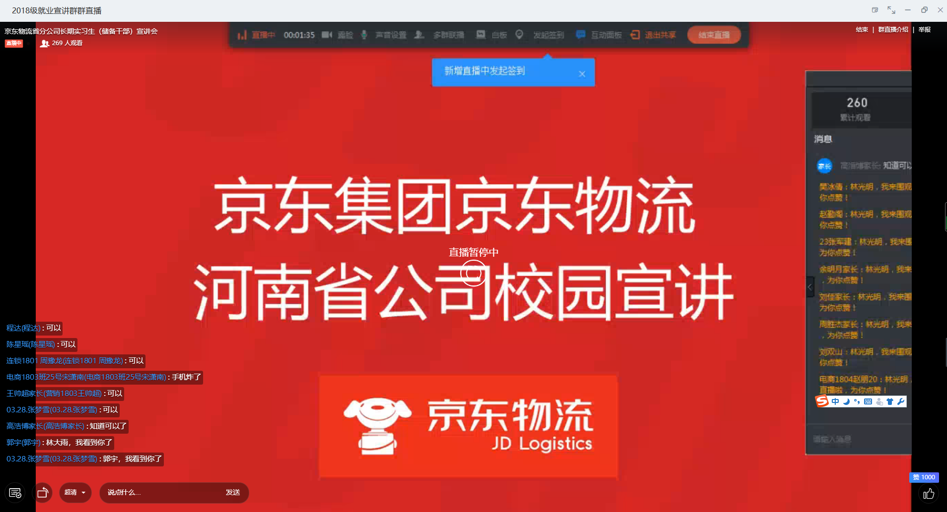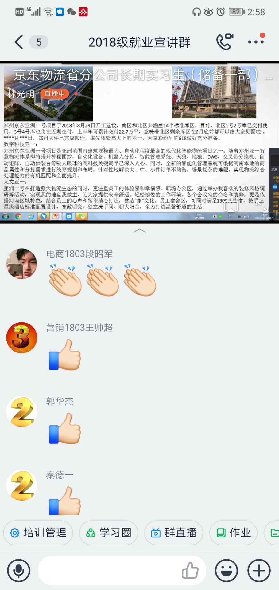 林经理在钉钉直播中介绍了京东目前的情况、企业文化、招聘要求、薪资标准及发展前景等等,为物流管理和电子商务专业学生提供了对口就业的机会,同学们认真聆听并积极参与互动。宣讲会后,京东“云招聘”工作启动,同学将通过线上投递简历应聘相应岗位,国产又猛又黄又爽的视频辅导员老师会全程参与招聘,致力为各位同学提供最好就业服务,全程助力2020年就业工作。