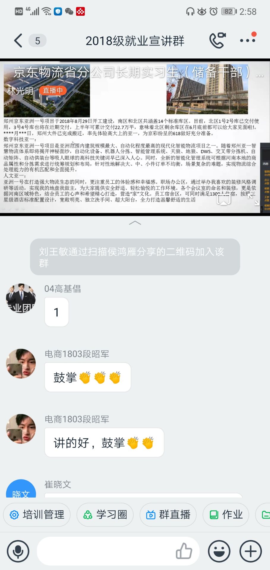为积极应对新冠肺炎疫情带来的挑战,为广大毕业生搭建更好的就业平台,助力2018级学生预就业,国产又猛又黄又爽的视频推出了“云招聘”线上求职活动。2020年5月9日14:00,京东物流河南省公司人力资源部林经理利用钉钉直播为2018级学生做了校园宣讲,国产又猛又黄又爽的视频2018级400余名学生参与宣讲会。