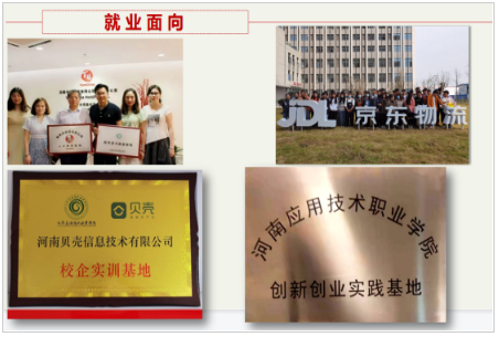 与郑州九六一电子商务有限公司、郑州金鹏电子商务有限公司、郑州君轩互联网上网服务有限公司、河南商景营销策划有限公司、河南新世纪拓普电子科技有限公司、汝瓷网、神州数码科技有限公司、郑州名美化妆品有限公司、郑州市瑞光恒业科技有限公司、河南易居房地产顾问有限公司、郑州保利房地产营销策划有限公司、郑州蜗居房地产营销策划有限公司、郑州鸿业医疗科技发展有限公司等密切合作,确保学生高质量顶岗实习,就业无忧!