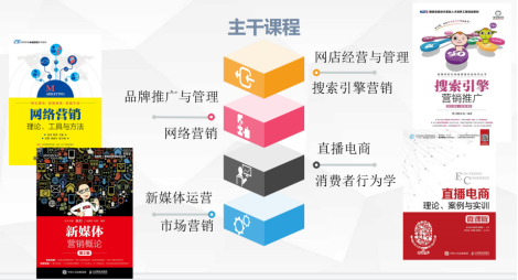 网络营销、直播电商、搜索引擎营销、品牌推广与管理、网络广告新媒体营销、社群营销、管理学、电子商务基础与应用、市场营销、商务谈判、电子商务技能训练、商务数据分析与应用、商品信息采编消费行为学、经济学基础、电子商务法律法规、经济法、商务礼仪、网店经营与管理、电子商务客户服务等。